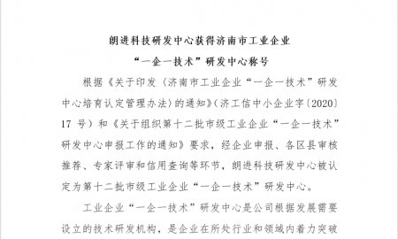 朗进科技研发中心获得济南市工业企业 “一企一技术”研发中心称号