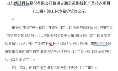 山东朗进科技股份有限公司轨道交通空调系统扩产及技改项目(二期)竣工环境保护验收公示